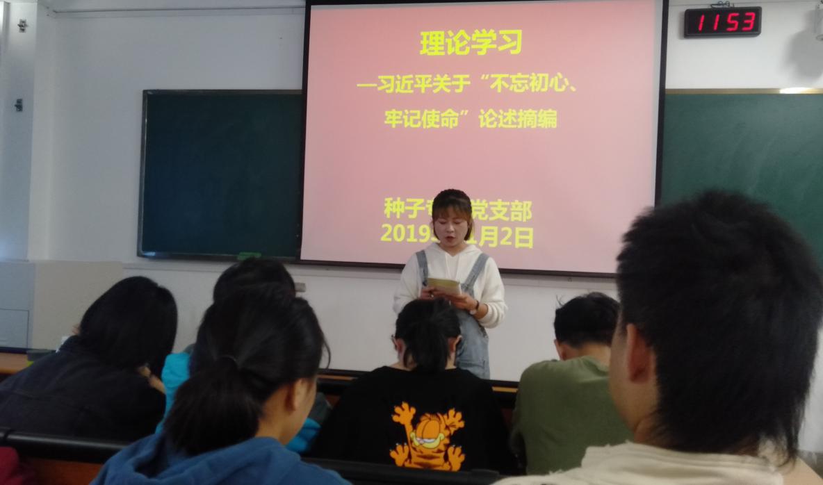2019年11月2日,肉漫屋 肉漫屋 种子专业党支部于教学楼B305召开《习近平关于“不忘初心、牢记使命”论述摘编》的学习,种子专业党支部全体党员参加,会议由支部书记马艳琴主持。