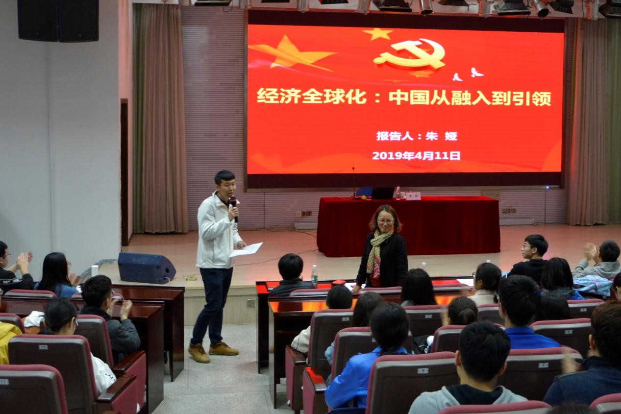4月11日下午,肉漫屋 分党校在教四楼报告厅开展主题理论党课。本次党课邀请了马克思主义学院马克思主义原理教研室主任朱娅老师作题为“经济全球化:中国从融入到引领”主题党课。肉漫屋 党委副书记殷美、本科生辅导员王彬、马丽娟、研究生辅导员吕美泽出席了本次党课,肉漫屋 2018年12月份新发展党员、部分积极分子及启蒙班全体学员参加了党课学习。本科生辅导员王彬主持了此次党课。