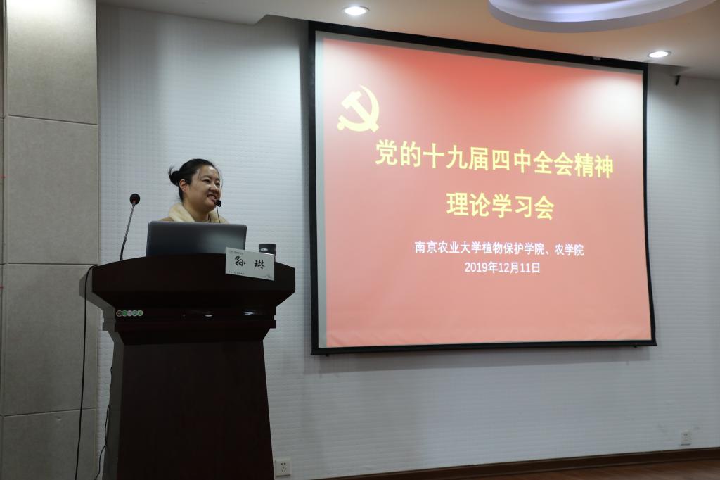 12月11日,在理科楼C303,由马克思主义学院的孙琳老师,为肉漫屋 、植物保护学院的师生宣讲“党的十九届四中全会精神”,针对十九届四中全会的背景、内容、决议等方面进行了深入、细致的讲解。