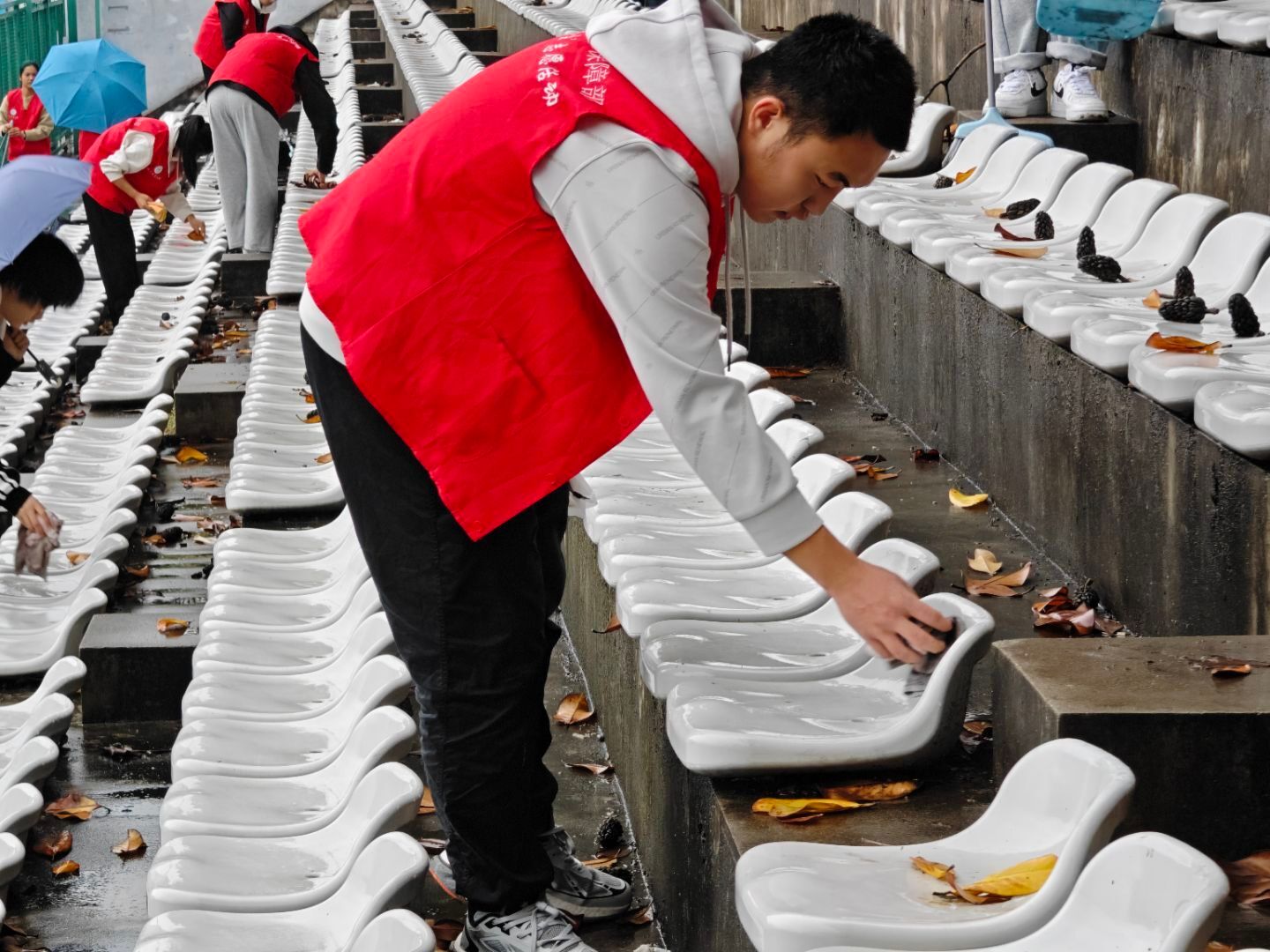 本学期第一次阳光清“尘”志愿活动于11月9日上午9:00于卫岗校区正式开展。同学们按照各自的分工,带着抹布、扫把、簸箕等工具准时到达集合地点,随后分组前往分管区域。活动过程中,同学们认真细致,配合默契:一部分同学手持抹布,俯身仔细擦拭着看台座椅上的灰尘与污渍,不放过任何一个角落;另一部分同学则拿着扫把,认真清扫看台台阶上的落叶和垃圾,连椅背缝隙里的垃圾也没有放过。
