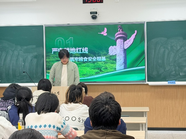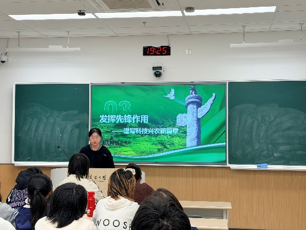 第三部分,武文瑞同学围绕“发挥先锋作用——谱写科技兴农新篇章”展开论述,明确新时代农科学子与青年党员的使命担当。从国家粮食安全战略高度,强调耕地数量、质量、生态保护对国家自立自强的极端重要性,介绍我国耕地保护制度的创新突破与“空天地网钻”一体化监测等智慧监管手段;通过卞新民教授、沈其荣院士等专家学者的科研实践,以及杨蕾博士生改良苜蓿品种、朱艳副校长团队研发智能农业技术等事例,展现科技赋能耕地保护、助力农业提质增效的强大力量;最后提出“把论文写在大地上”的实践号召,引发参会人员对农科学子如何在“藏粮于地、藏粮于技”战略中发挥模范带头作用的深入思考。