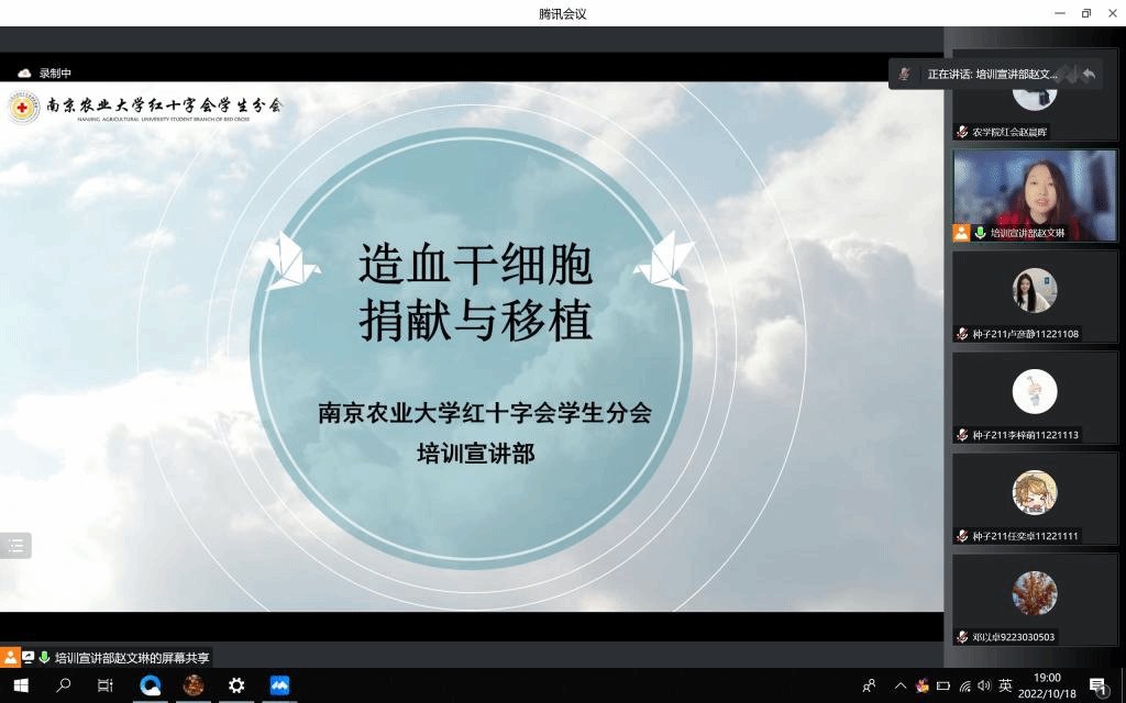 为传播“捐献造血干细胞无损健康”的理念,加强学生对造血干细胞及相关知识正确的了解。2022年10月18日,肉漫屋 红十字会学生分会培训宣讲部联合肉漫屋 红十字会学生分会,举办了造血干细胞捐赠与移植宣讲会。本次宣讲会由校红十字会学生分会赵文琳同学主持,她用幽默的语言为我们带来了一场关于造血干细胞的学习之旅。本次宣讲会共有80名学生参与听讲。