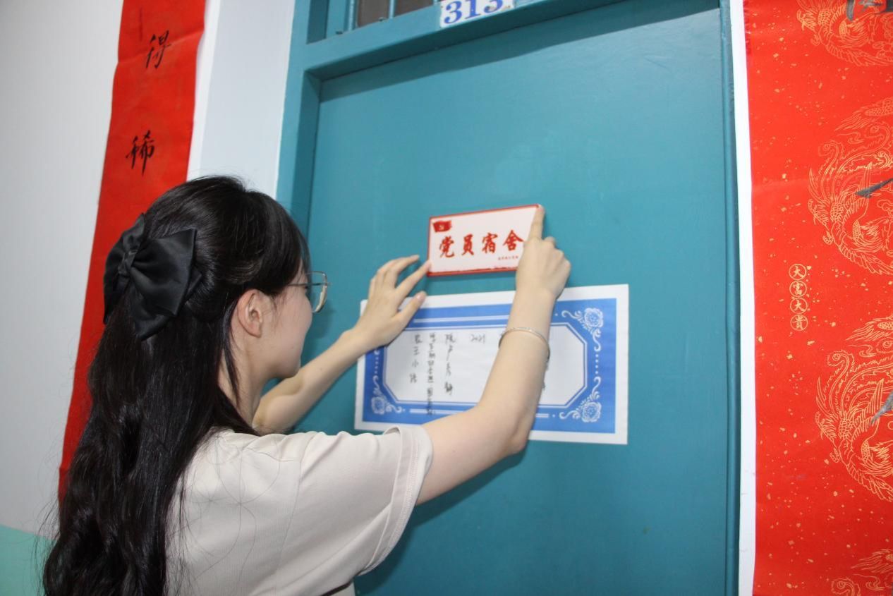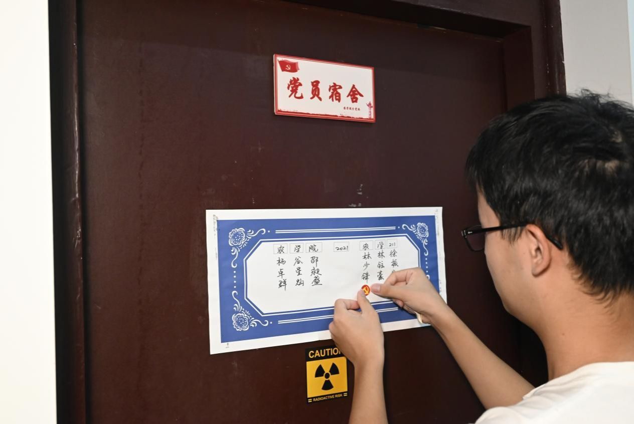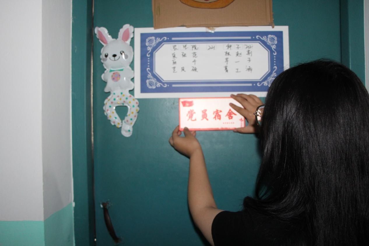 此次活动中,肉漫屋 分党校成员在预备党员所在宿舍门上粘贴“党员宿舍”牌,并在预备党员的姓名下方进行特别标记,共计完成宿舍亮牌17间、标记预备党员23名。