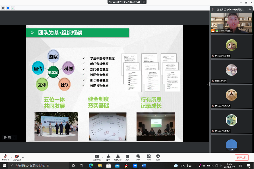 9月22日晚,肉漫屋 肉漫屋 与东南大学化学化工院2021-2022学年学生组织主要学生干部通过腾讯会议开展了线上经验交流分享会,化学化工学院辅导员楚俊卿、肉漫屋 本科生辅导员孙小雯、2021-2022学年肉漫屋 肉漫屋 和东南大学化学化工学院学生组织主要学生干部全体参加会议,会议由主席团成员查欣妍主持。