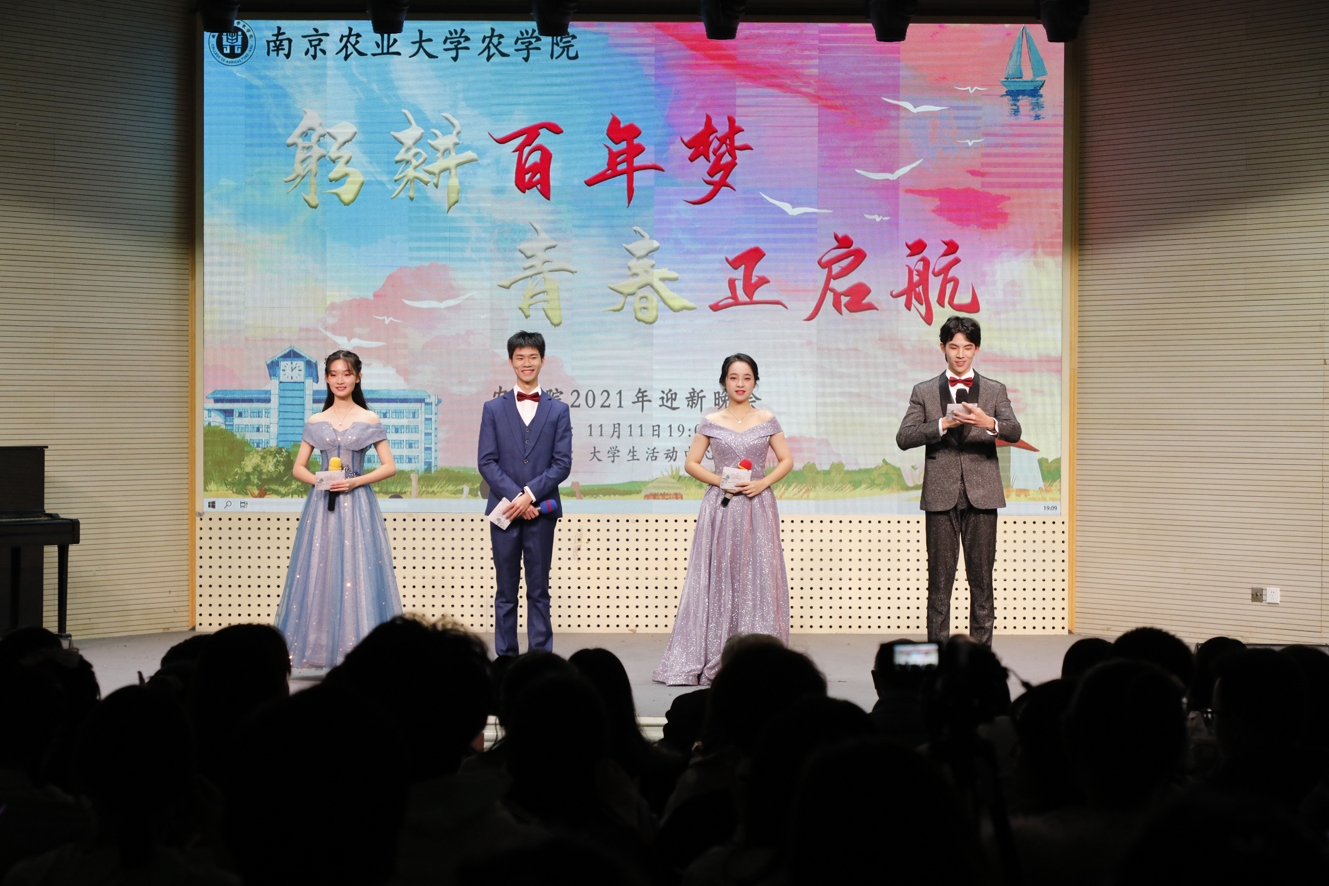 本次晚会是新生们第一次集体亮相,即是欢迎大家到来的盛会,更是启程的号角,2021级新生,肉漫屋 欢迎你们的到来,躬耕百年梦,青春正启航!