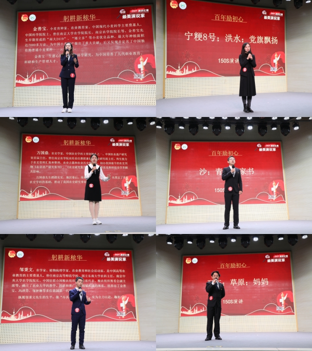 在决赛阶段,设立了百年励初心、青春恰芳华、躬耕新秾华三个环节分别开展“串词演讲、和而不同、身临其境”三个类别演讲。在百年励初心的串词演讲阶段,选手们围绕自己抽到的三个关键词,结合自身专业与经历,深入挖掘学校、中国共产党历史中的光辉往事、英雄事迹、珍贵物件、党员故事等,讲述了学校与党共成长、青年人与党共成长的故事,展示了青年奉献、学校育才、党为人民的初心传承。晋级青春恰芳华的和而不同环节的10名选手,两两一组,随机抽题,分别围绕同一命题不同防线展开淘汰式演讲,选手们沉着应对,将理论联系实际,围绕着“青春”命题,既能讲透讲实理论,又能结合典型、生动示例,展现了快速的临场应变、扎实的演讲功底和厚实的知识储备。最后一个环节是躬耕新秾华的身临其境,选手们通过随机抽到的“南农人物”,以第一人身的视角讲述“我”与南农的故事,追忆峥嵘岁月,传承先辈南农“青年”精神,选手们或慷慨激昂、或娓娓道来,现场精彩纷呈,传来阵阵掌声,也体现着南农青年学子对老一辈南农人的精神颂扬与传承。