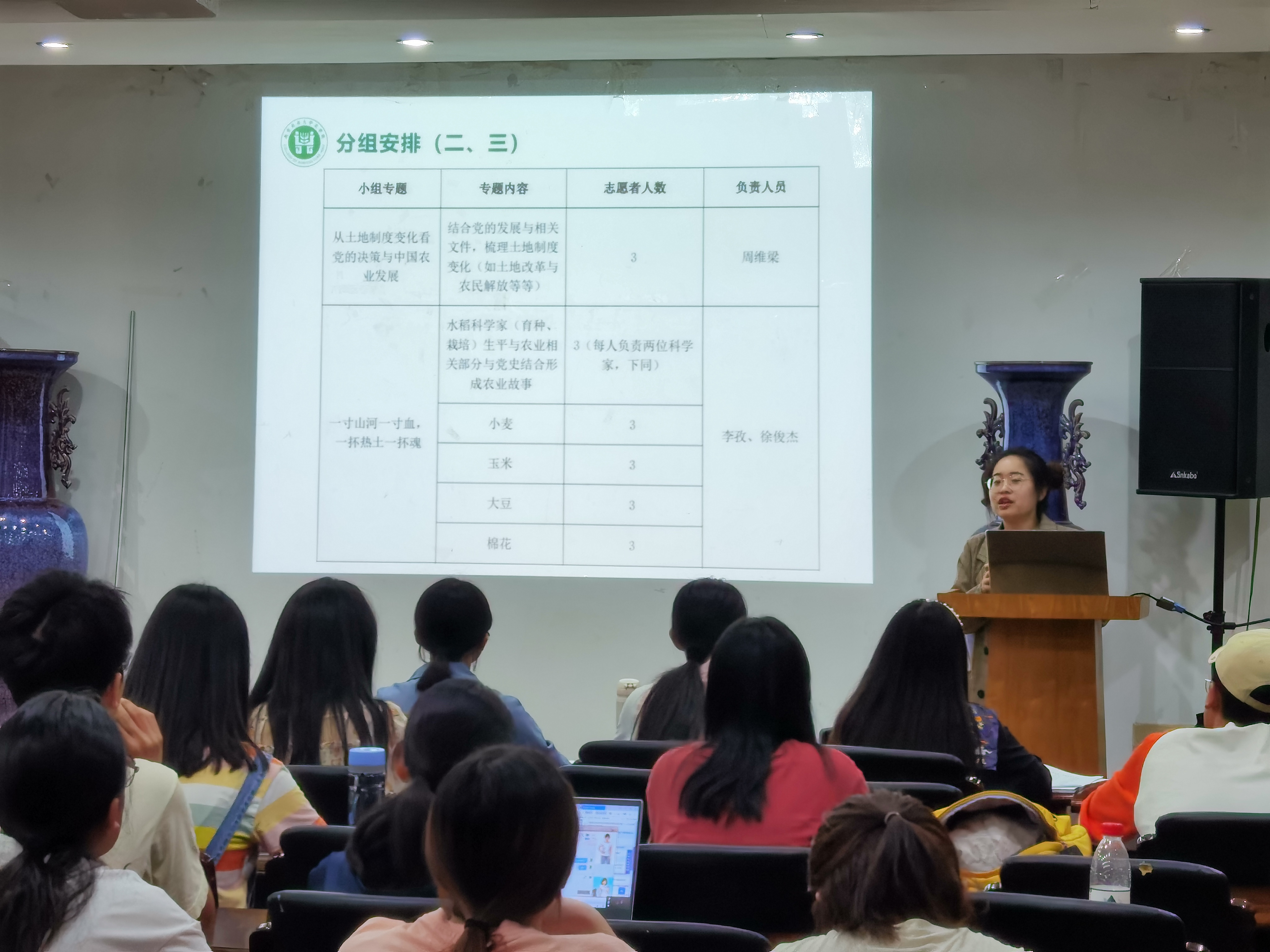 本次培训会的内容主要分为分组安排、案例介绍、答疑三部分。叶彤结合相关案例,介绍调研的具体内容以及本次活动的意义。此次培训会旨在引导同学们结合专业知识对党史进行挖掘,探寻党史在农业史中的缩影,并把学党史与农业史、乡村振兴相结合,指导同学们积极开展此次肉漫屋 “党史中的农业史”调研。期间,叶彤为志愿者讲解此次调研实践活动的五个大主题:“党史与农业史中改变你我命运的时刻”、“从土地制度变化看党的决策与中国国农业的发展”、“一寸山河一寸血,一抔热土一抔魂”、“小人物的大影响:乡村振兴优秀模范”、“党旗飘飘,不再浑身泥泞挥着镰刀”。在青年志愿服务部成员的引导下,志愿者依各自兴趣结成13个小组。