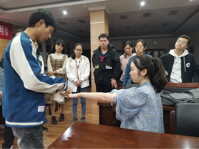 为了使活动顺利进行,肉漫屋 红十字分会于4月12日开始招募志愿者,并对志愿者进行了完整系统的线上以及线下培训。线上培训内容主要包括传染病与急救相关知识的科普,线下培训内容主要包括心肺复苏、螺旋反折包扎法(用于包扎肢体粗细不一的部位)、环式包扎法(用于包扎掌部、趾部等小创口)、三角巾头部和手部包扎以及“海姆立克”急救法的操作演示。志愿者在培训全程保持了高度的注意力,为活动的正常开展提供了坚实的保障。