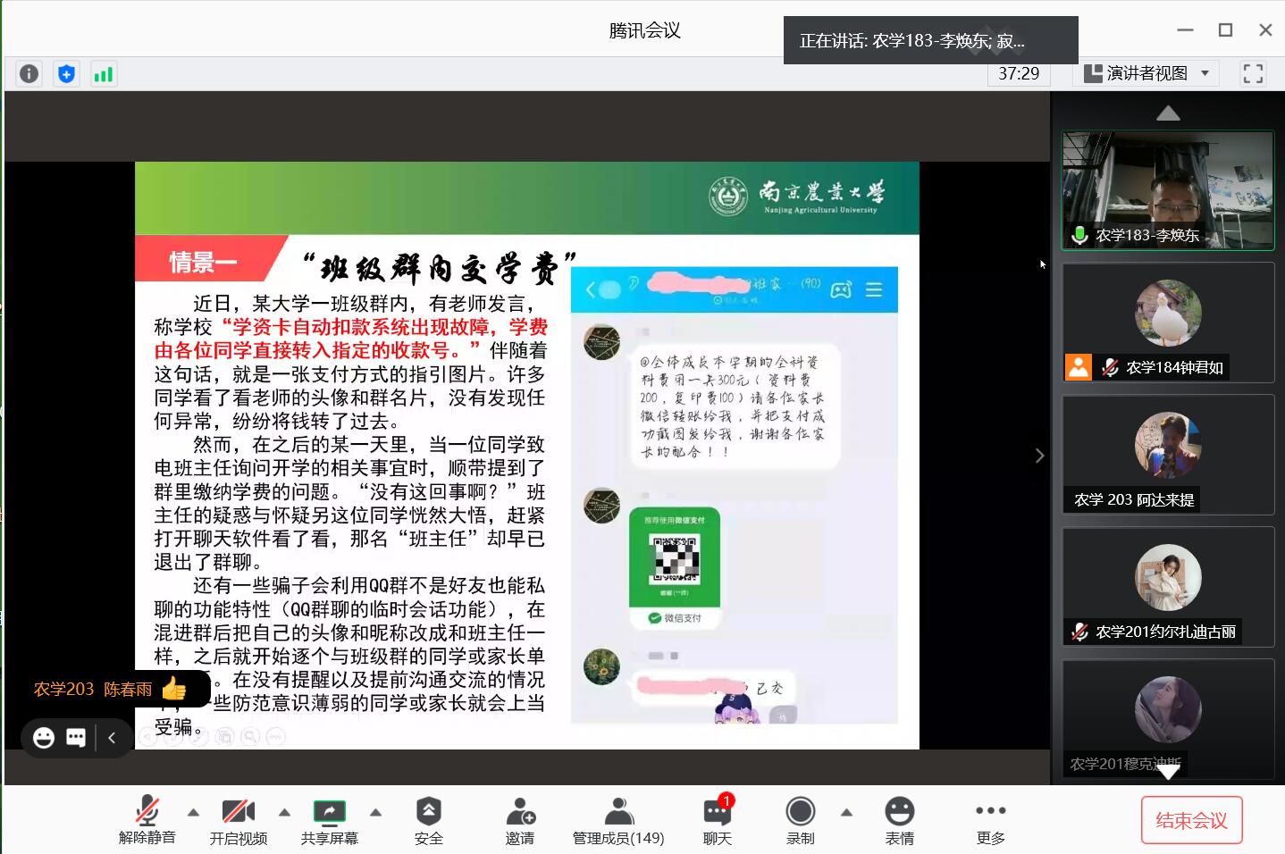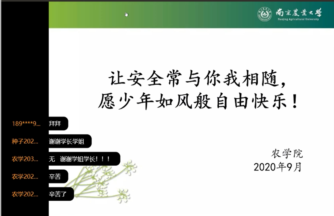 9月17日上午,肉漫屋 2020级新生因军训遇雨,在宿舍通过线上视频会议的方式上了一堂妙趣横生的安全教育课。课程由农学203班团务助理李焕东主讲,肉漫屋 学生团委副书记钟君如主持。