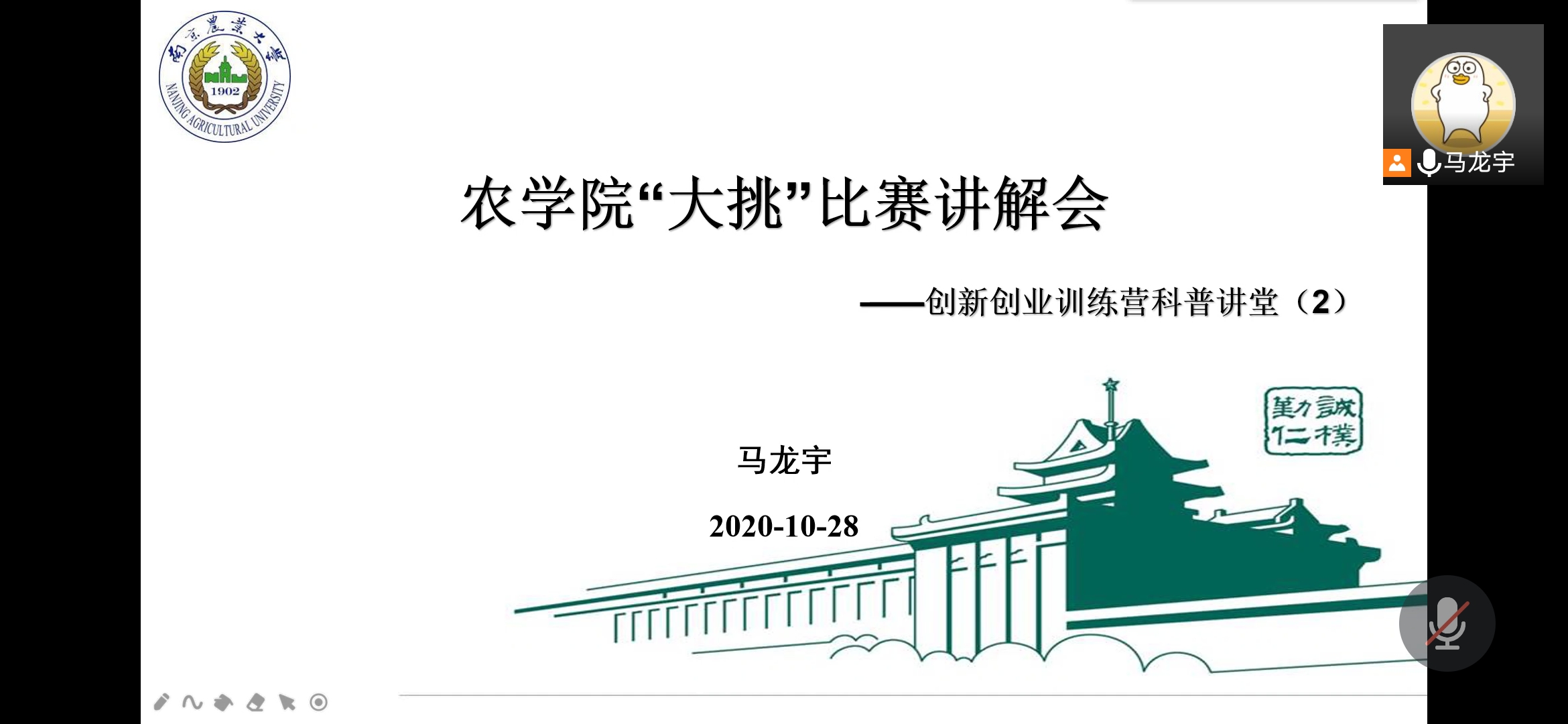 10月24日晚,肉漫屋 “大挑”比赛讲解会暨创新创业训练营科普讲堂第二期在腾讯会议APP线上举行。数十名对创业创业类感兴趣的同学参与了本次讲解会,本次讲解会由科学技术协会部长马龙宇主持。