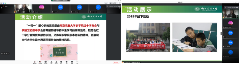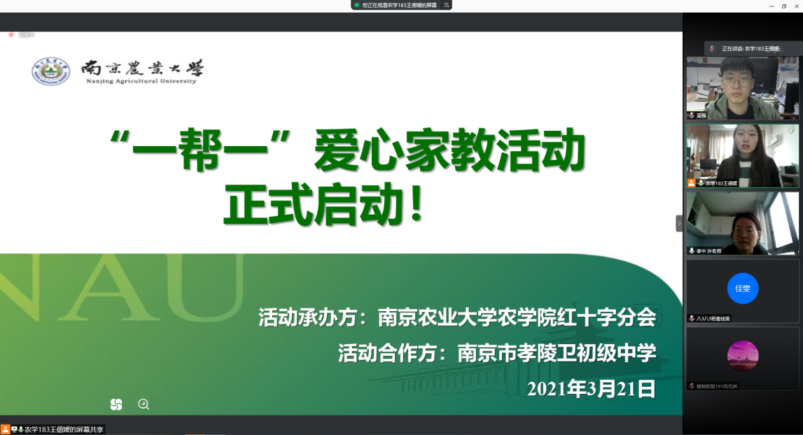 2021年3月21日上午9时,肉漫屋 红十字分会在线上腾讯会议举办了本学期“一帮一”爱心家教启动仪式。肉漫屋 肉漫屋 高强老师、孝陵卫初级中学许凤银老师、来自肉漫屋 的志愿者和孝陵卫初级中学的八年级同学及其家长参加了本次启动仪式。本次启动仪式由肉漫屋 红十字分会部长王偲媛同学主持。