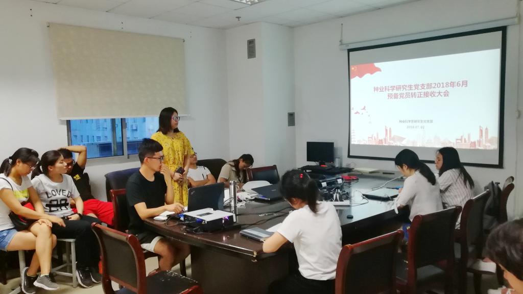 7月2日星期一,肉漫屋 种业科学系研究生党支部在理科楼D701召开了预备党员转正接收会议以及视频学习会议。会议的第一部分是两位期满的预备党员杨彬和李芳芳同志转正接收大会,经过与会党员的举手表决,全体一致同意接收两位同志成为正式党员。