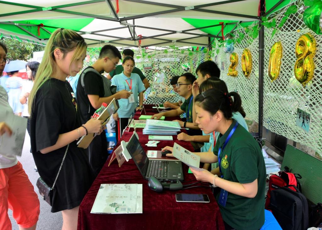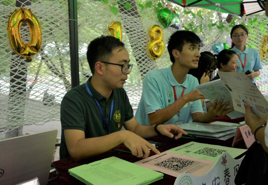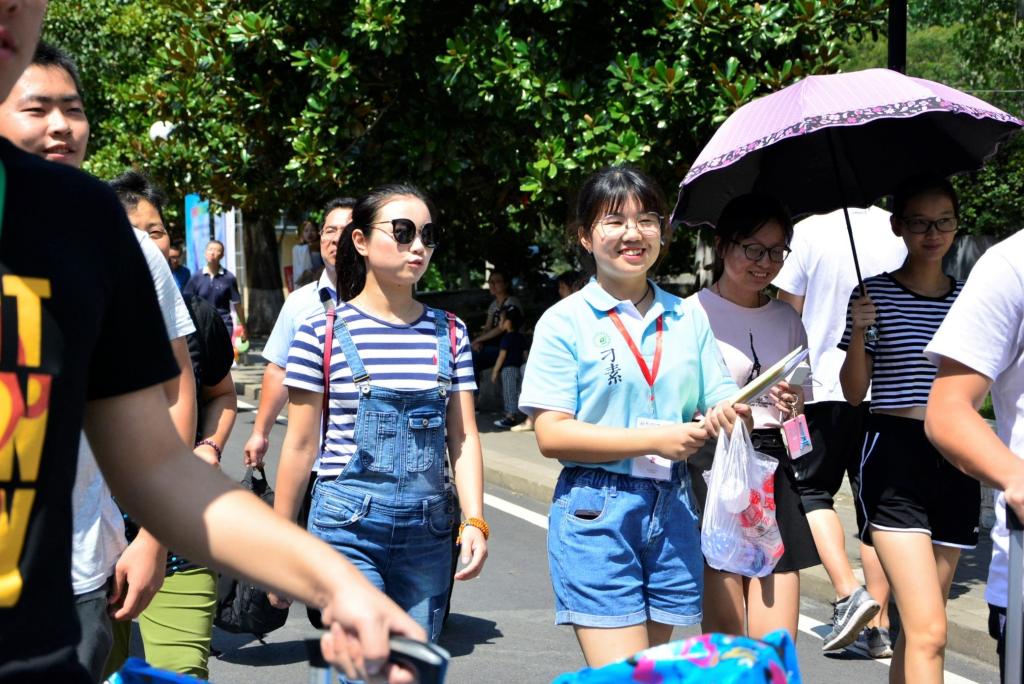 新生从踏进学校的那一刻起,就被肉漫屋 的学长学姐们全程守护。肉漫屋 今年在主楼、教四楼和樱花大道设立了三个迎新引导点,学生会成员带领着志愿者将新生和家长带至玉兰路的迎新点。