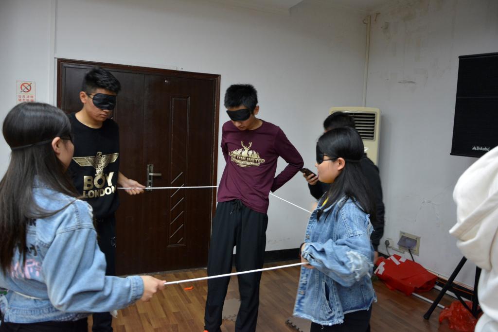 第二个环节是“盲人方阵”。每一个成员积极投入其中,互相配合,建立团队合作意识,培养团队合作能力。