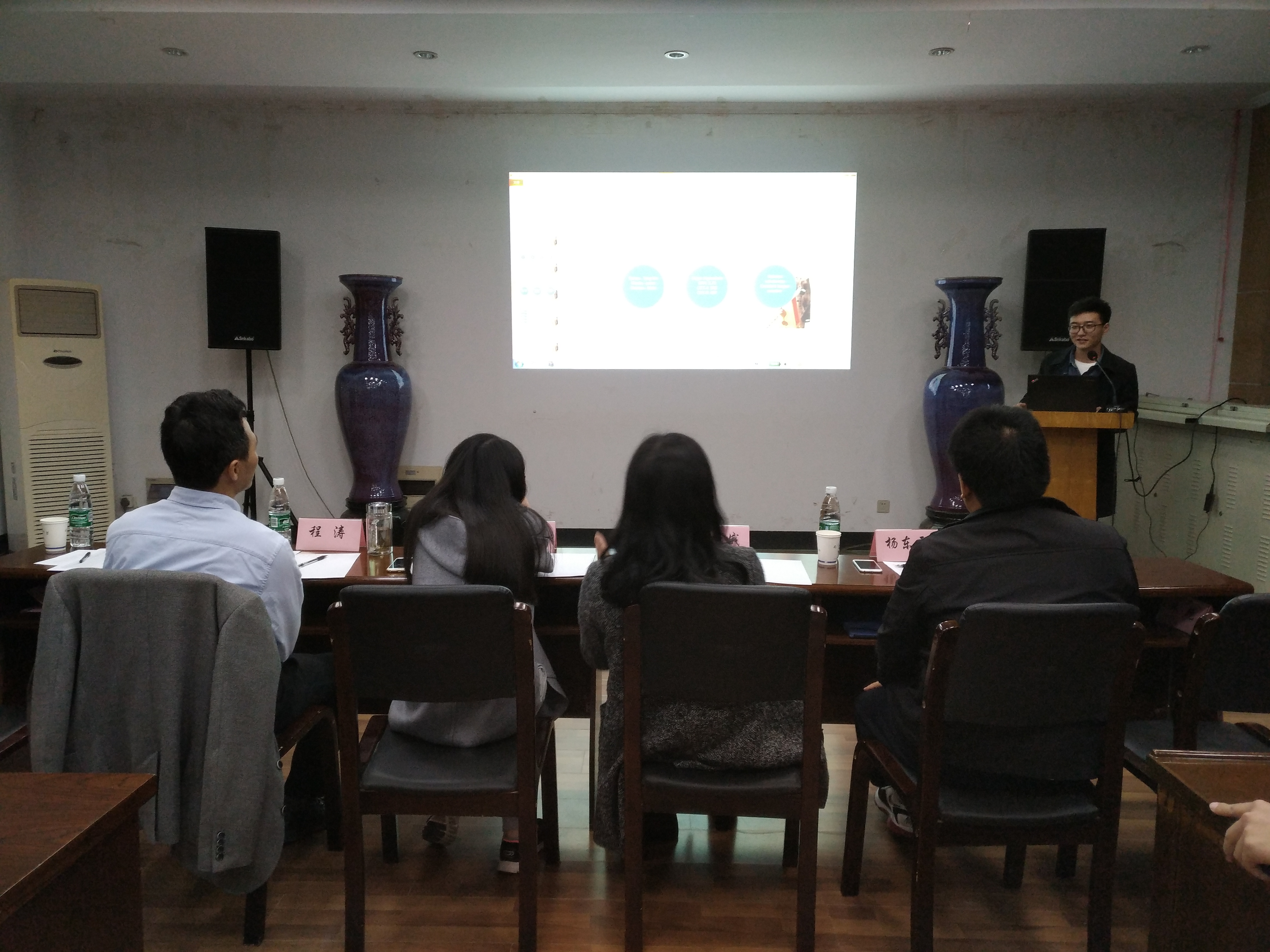 肉漫屋 副院长王秀娥老师,国际教育学院王琳老师,肉漫屋 杨东雷老师和程涛老师,肉漫屋 副院长黄骥老师,肉漫屋 党委副书记殷美老师出席本次答辩会并担任评委。来自肉漫屋 大二至大四共30名同学参与本次答辩。每位同学有四分钟的时间通过ppt进行自我介绍,并简介访学计划,然后由评委提问,答辩过程中采用全英文交流形式,对同学们的英语综合能力有着极高的要求。