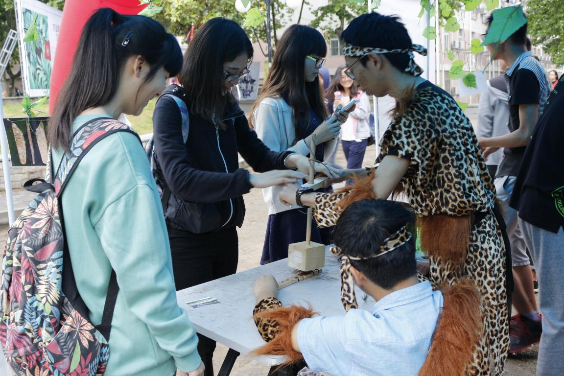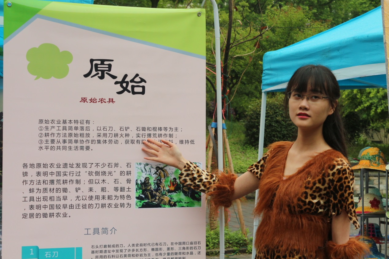 各展区设置了丰富多样的展出形式,在原始农业区,工作人员现场重现了“钻木取火”的过程,并对“刀耕火种”耕作方式的原理进行讲解和现场模拟演示。并通过知识问答的形式,让同学们对农业的起源有了具体的理解。