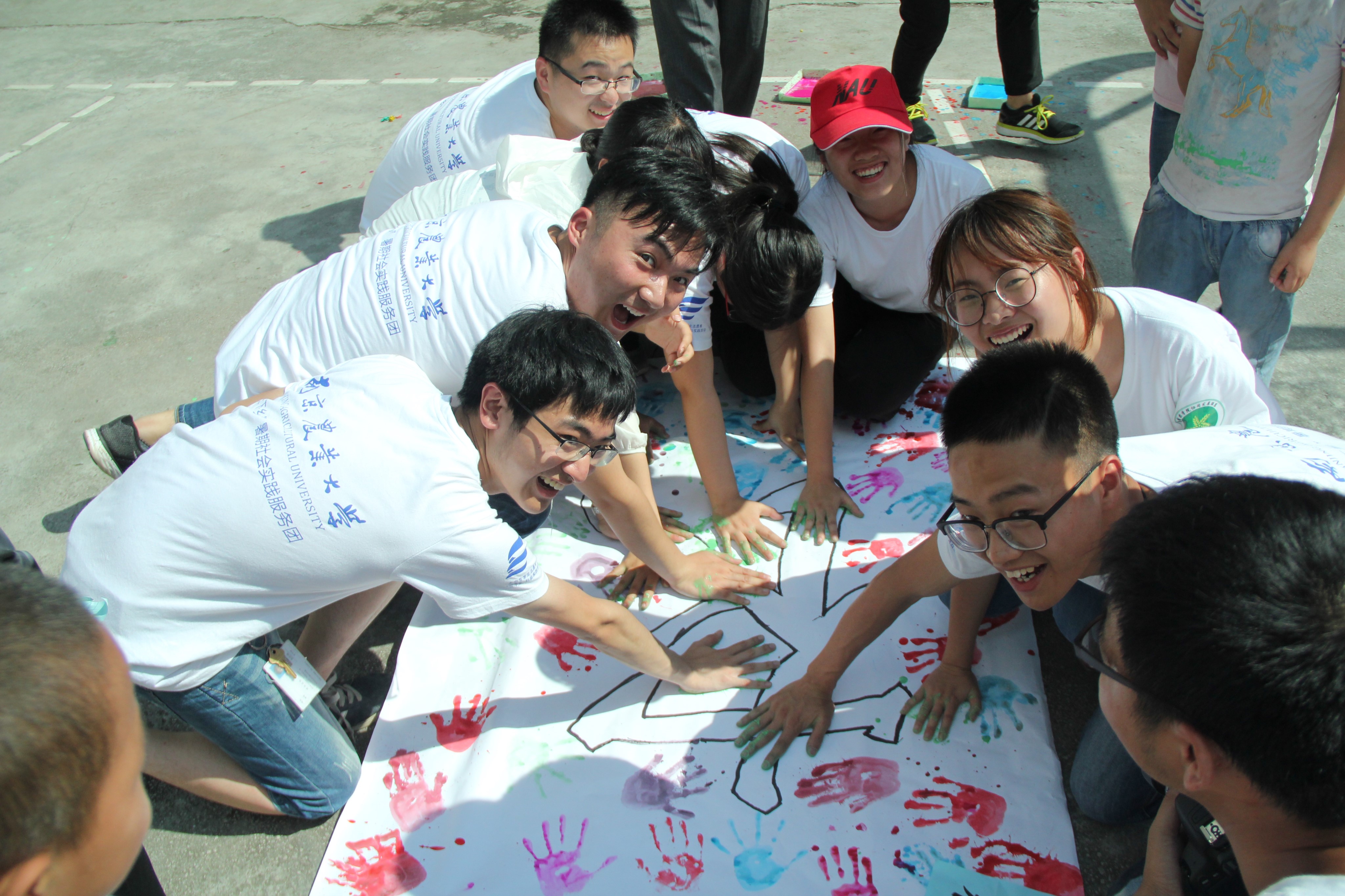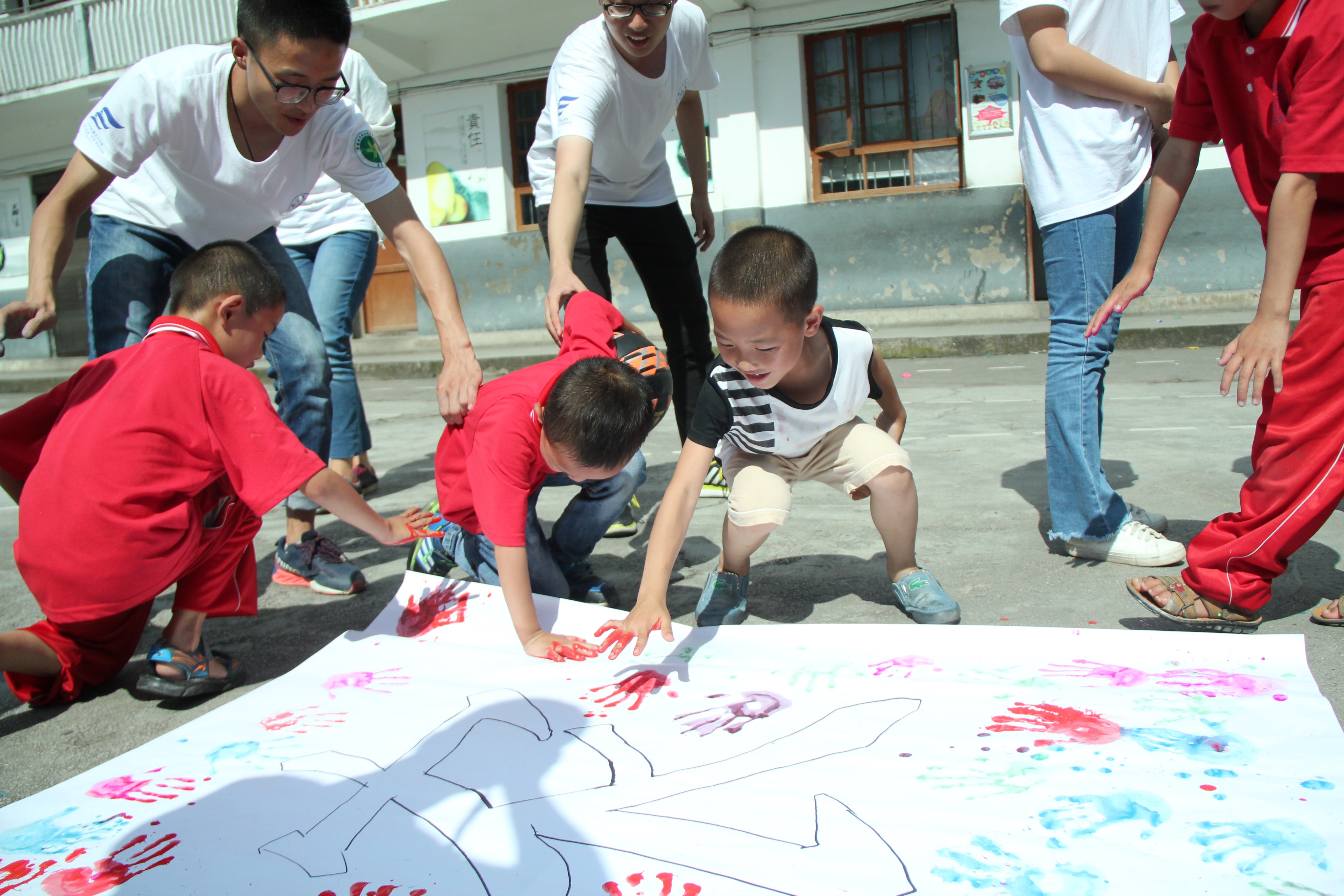 孩子们与实践队员一起在画幅上印上自己的手印