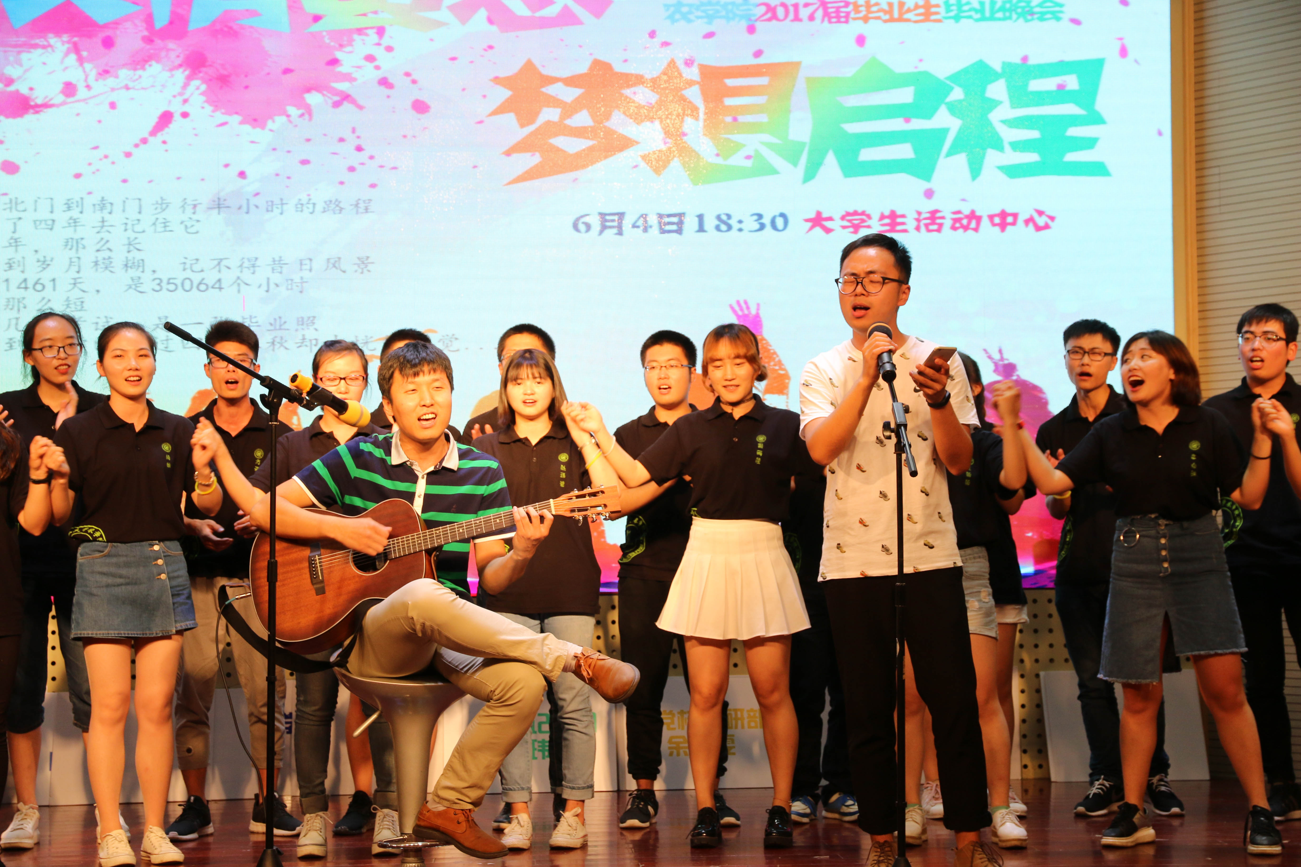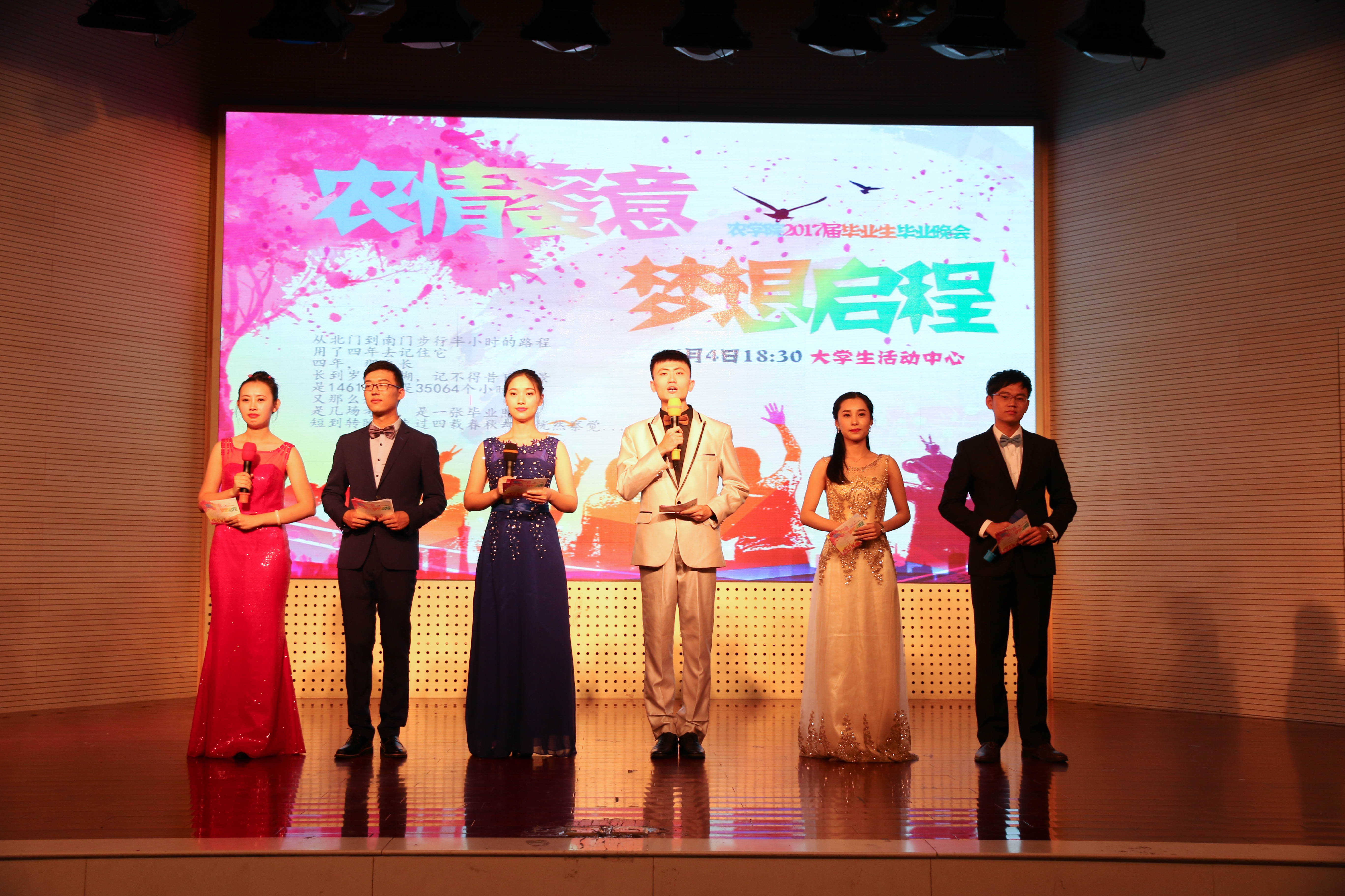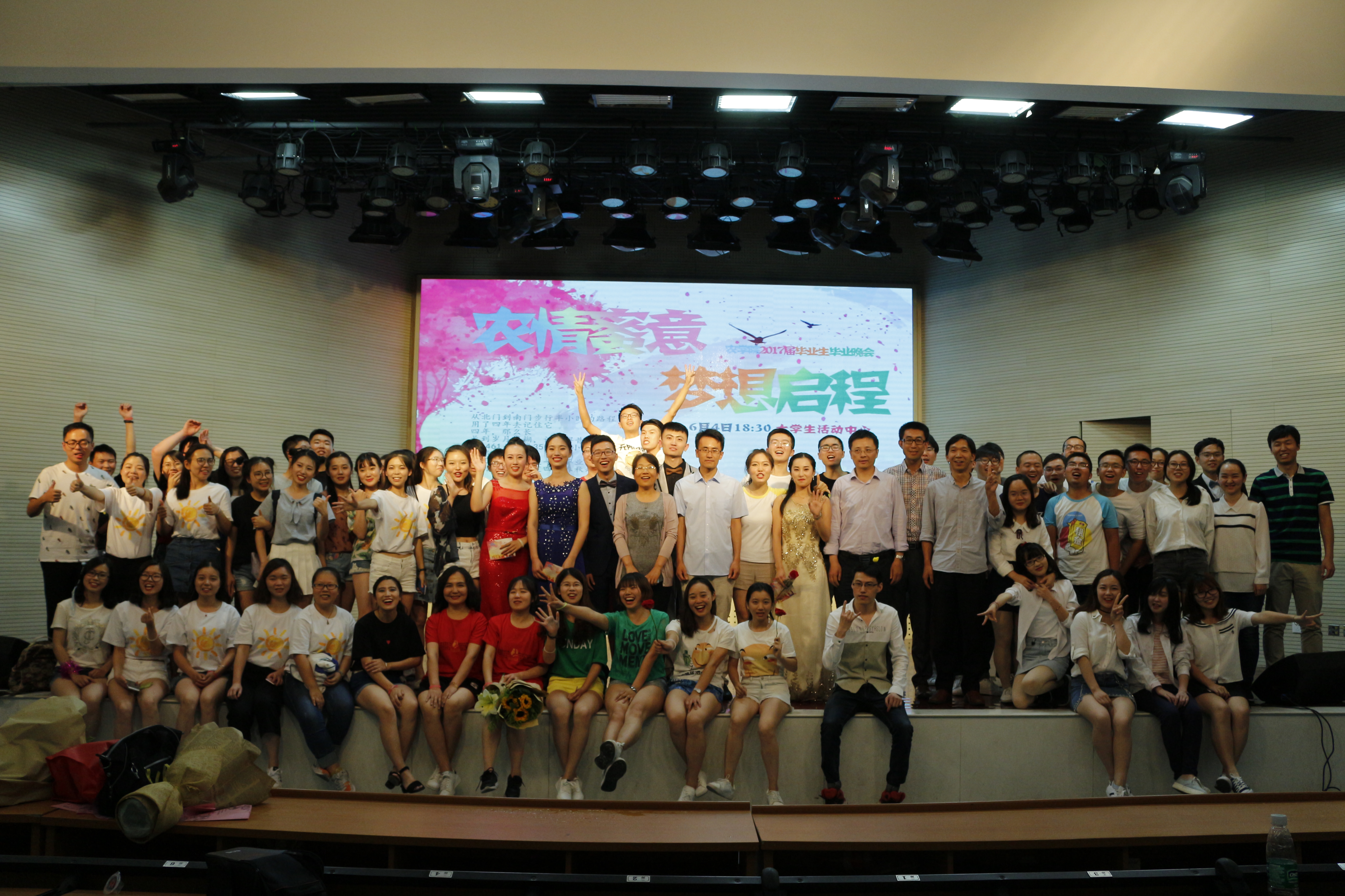 本次晚会以“浓情蜜意,梦想启程”为主题,分为“青春的初遇”, “美丽的邂逅”, “梦想的起航”三个部分。13级同学们以歌舞、情景剧、话剧等形式展示了对学习生活的态度以及同学之间的纯真友情,将场上气氛不断推向高潮。农学133班的歌舞表演《歌舞青春》活力四射,种子132班情景剧《有妖气》创意地将各大经典串连在一起,农学132班舞蹈串烧《不如跳舞》和种子132舞蹈剧《NANAland》也跳出了青春,展现了活力,农学134班话剧《铁锹的名义》以及植物实验132小品《地铁那些事》以幽默的表演方式,贴近肉漫屋 学子生活,收到观众的一致好评。农学132 班通过校园剧《那些年》与同学们一起回顾了四年的大学生活,让人感动。14级团委学生会也用《你在烦恼什么》向学长学姐们送上了祝福。晚会上王老师、姚老师合唱的《老男孩》以及彭老师弹唱的《外面的世界》更将毕业晚会的气氛推上了高潮。之后,各班合唱《栀子花开》、《当,有了你》、《不说再见》、《南农》、《骄傲的少年在路上》、《再见》、《晚安》等歌曲,学弟学妹们也纷纷给毕业生们献上了鲜花和拥抱,歌声与鲜花表达着离别的伤感与不舍。