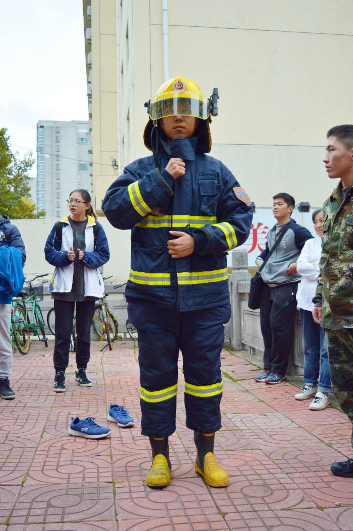 活动开始邀请了消防官兵对包括水枪,灭火器等消防器材进行展示,消防官兵还现场教授了消防衣的穿脱步骤,让同学们体验了消防士兵的不易。