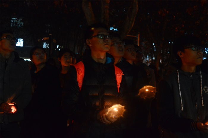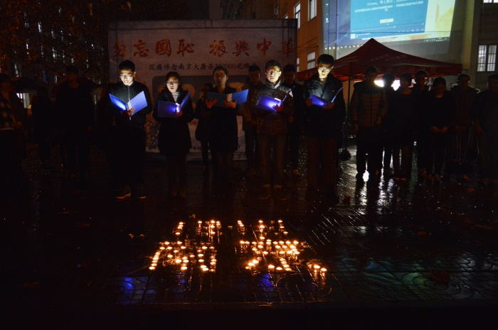 晚上7:00,肉漫屋 分党校组织本院的全体党员和预备党员观看了“南京!南京!”的部分片段,并用蜡烛摆出“南京,12•13”的字样,进行集体默哀,之后由党员代表和学生会成员带来的“战时母女对话”和“和平宣言”朗诵,借此来对大屠杀死难者进行追忆缅怀,警示广大青少年勿忘苦难中逝去的生命,勿忘民族曾经的苦难,勿忘国耻,勿忘所有英勇献身的英烈和为国做出贡献的人们,勿忘曾经的战争创伤,牢记历史,负重前行,振兴中华。