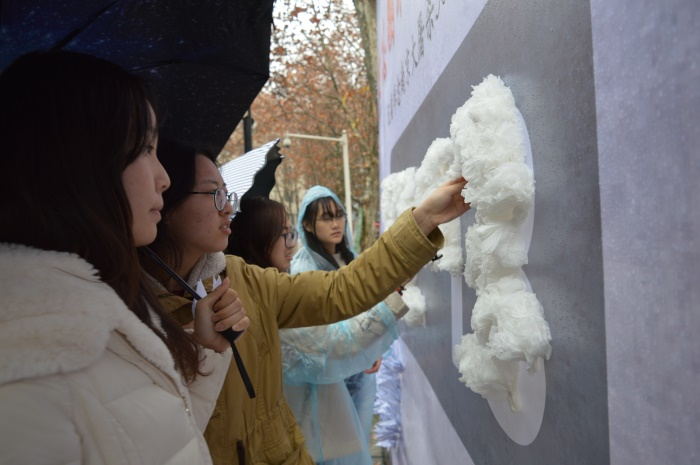 中午11:30,在肉漫屋 玉兰路,肉漫屋 团委学生会组织了百人签名活动。细雨蒙蒙中,同学们在写有“铭记历史,珍爱和平,追忆英烈,勿忘国耻”的白色横幅上郑重地签下自己的名字,写下自己对和平的美好期盼。此外,同学们还用自己亲手折的纸菊和千纸鹤在背景墙组成了“12•13”的字样和和平鸽的形状,借此来缅怀在南京大屠杀中遇难的30万同胞以及为抗日战争作出卓越贡献的革命先烈。