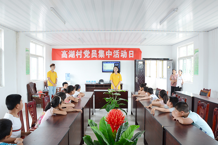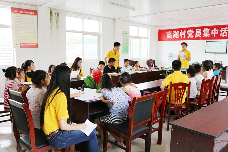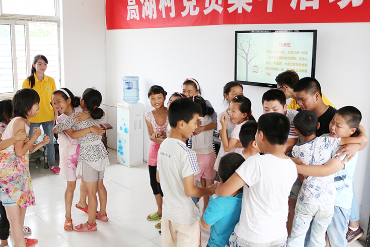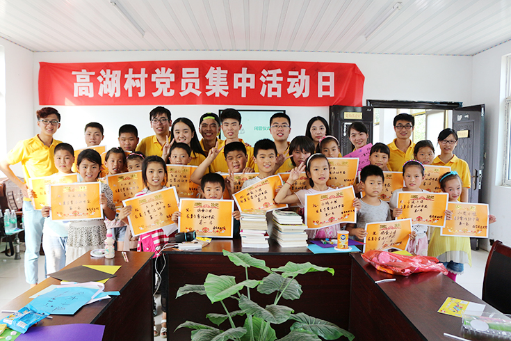 7月14日下午,肉漫屋 碧海青峰实践团来到百禄镇高湖村开展关爱留守儿童夏令营活动,与当地儿童一起交流,增进感情。