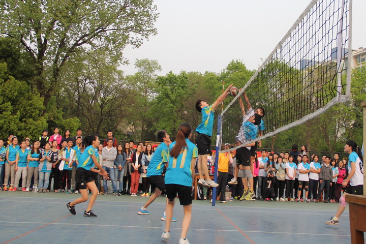 4月16日下午,校43届运动会排球赛决赛准时在排球场开打,由肉漫屋 对阵信息院。辅导员王彬老师率领肉漫屋 同学组成强大的啦啦队,为队员呐喊助威。