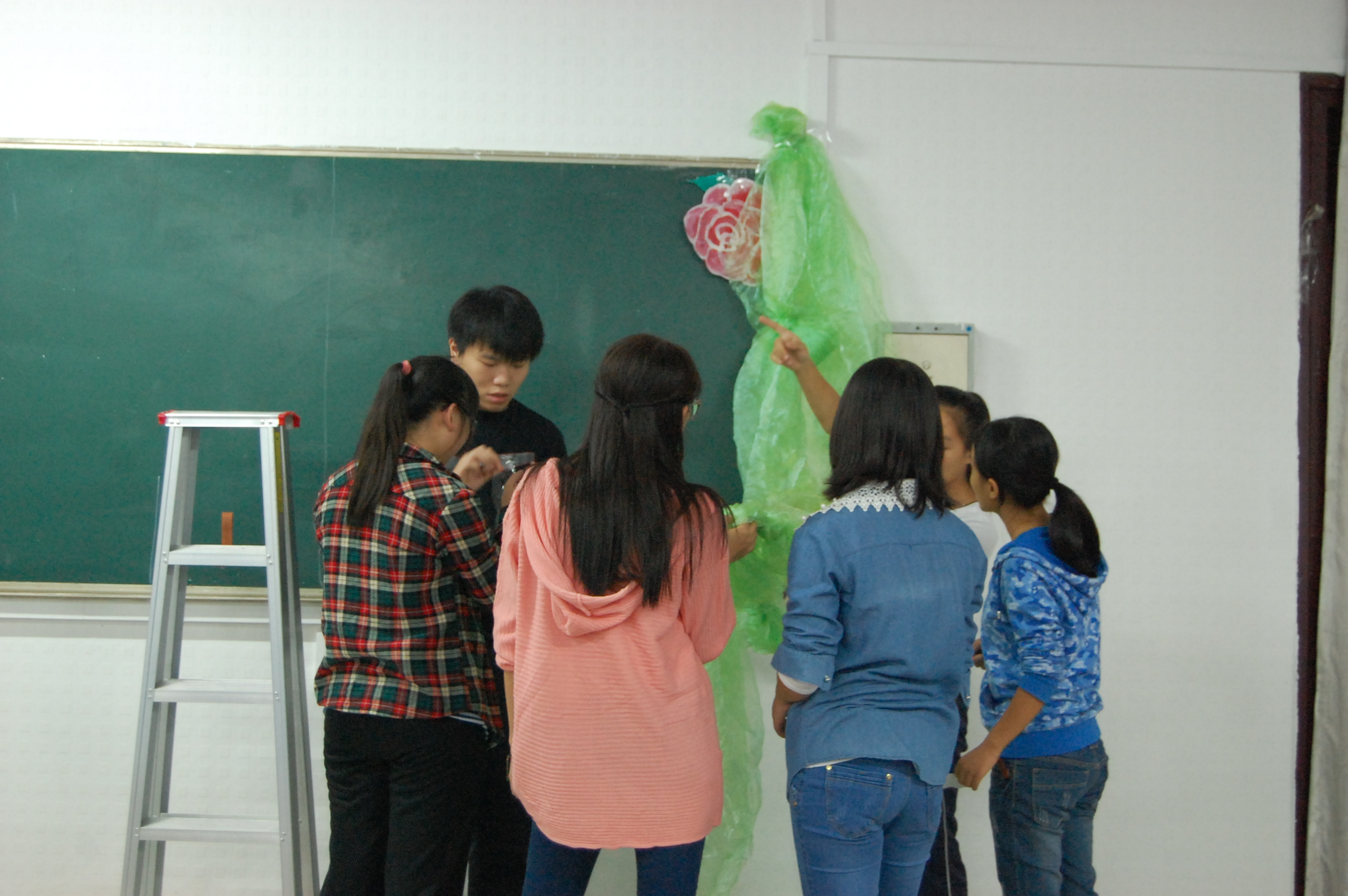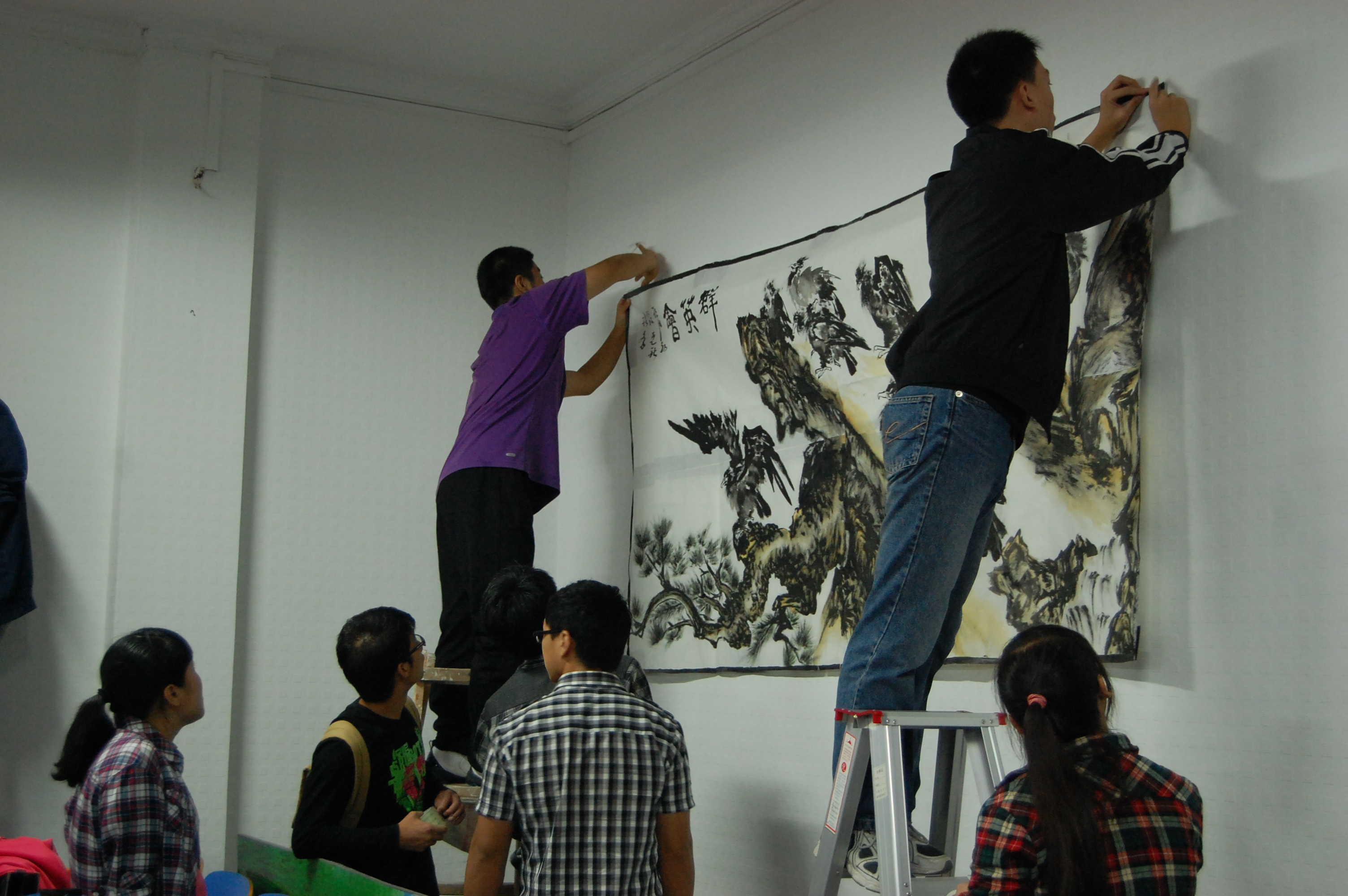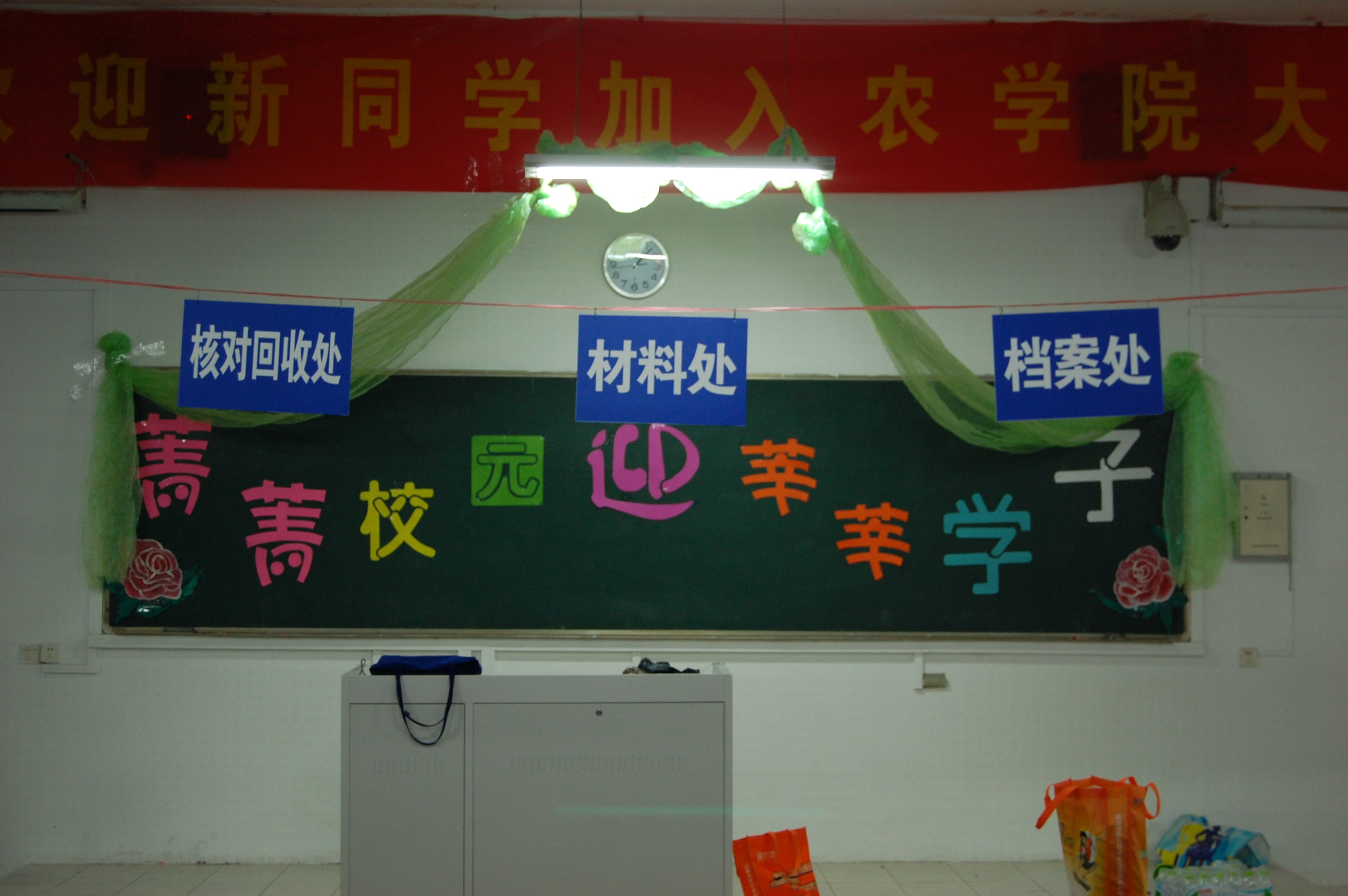 “今年的主题是‘菁菁校园迎莘莘学子’,是大家一起想出来的。会场的布置以营造温馨的气氛为主旨,让新同学们能感受到肉漫屋 大家庭的温暖。”学生会主席周庆鹏介绍道。门口摆放的宣传板上是学长学姐们的祝福寄语,黑板上贴着醒目的标语彩纸,窗户上装饰的是同学们吹出的五彩气球,墙壁上是动感的人物剪影贴纸。更有一幅气势雄浑的大型中国画为会场增添了浓浓的中国风,这幅画是才华横溢的宣传部部长丁园的杰作。大家团结协作,互帮互助,将肉漫屋 迎新会场布置的温暖美丽。