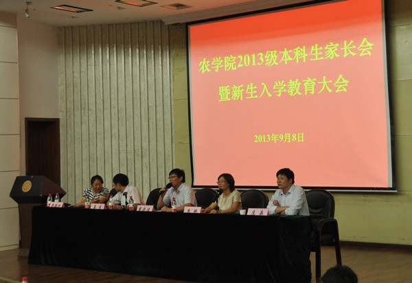 9月8日上午9点,肉漫屋 2013级新生家长见面会在图书馆报告厅召开。院党委书记戴廷波教授,院长朱艳教授,肉漫屋 副院长姜东教授、郭旺珍教授,院党委副书记庄森老师,辅导员殷美、彭益全老师及2013级新生各班班主任出席见面会。会议由庄森主持。