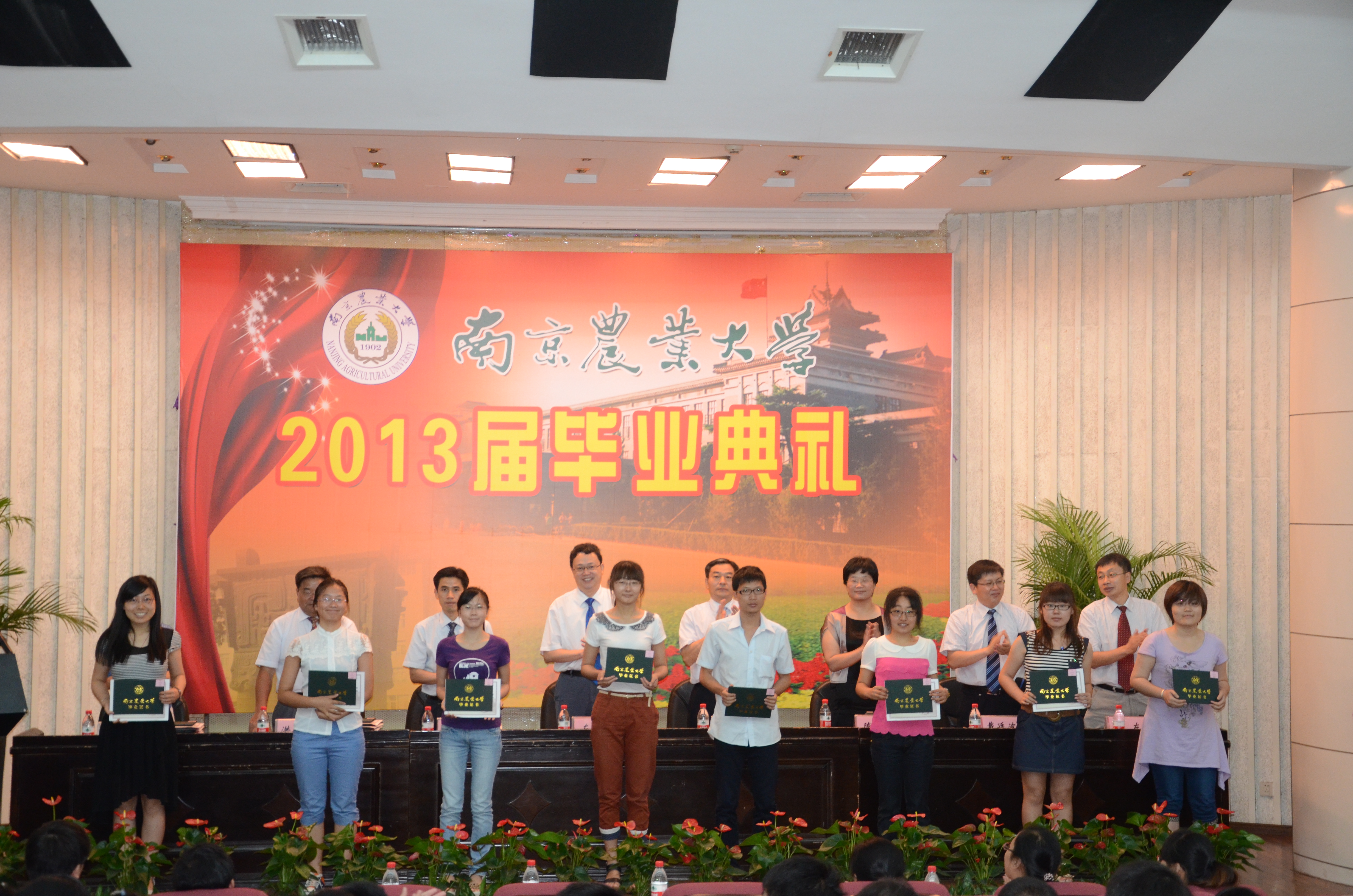 表彰完毕,在南农校歌的歌声中,各领导和来宾为肉漫屋 2013届本科毕业生颁发了优秀证书和毕业证书。