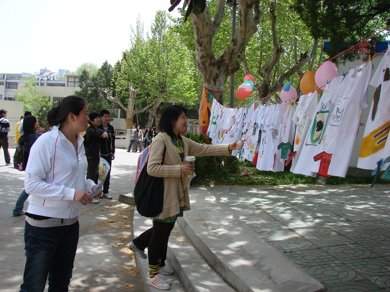 各班文艺委员积极负责,在院办领取白T恤与颜料后,分给参赛选手进行创作。最后,共有18件作品入围参与展出。