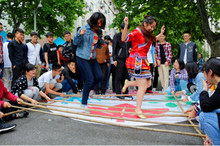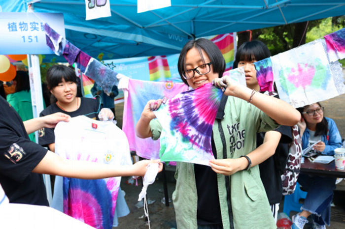 而现场祭春神、面部彩绘、扎染及跳竹竿舞等体验环节也吸引了许多同学参与,同学们通过祭春神及放河灯等环节,表达了自己对过去劳动人民勤劳的歌颂,对未来的美好祈愿。许多同学现场体验了一把面部彩绘,班级志愿者也向同学们解释了传统面部彩绘中表达的对大自然的敬畏及尊重,同学们都表示收获良多。扎染环节,同学们亲自动手扎染衣服,现场气氛热烈。在欢快的节拍里,伴着志愿者们的歌声,同学们纷纷加入跳竹竿舞的队伍,传来一阵笑声。